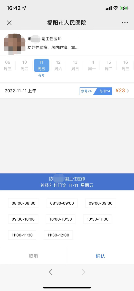 潇湘晨报记者查询揭阳市人民医院官方公众号发现,陈某某出诊时间为周五上午,目前显示11月11日(周五)可挂号。