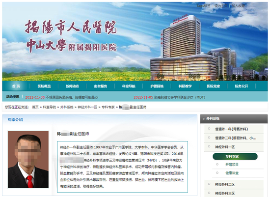 揭阳市人民医院官网显示,陈某某为神经外一科副主任医师,1997年毕业于广州医学院,中华医学学会会员,从事神经外科二十余年,有丰富临床经验。特别擅长神经外科显微手术,成功开展颅内肿瘤及椎管内肿瘤,脑血管畸形手术等。