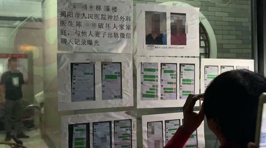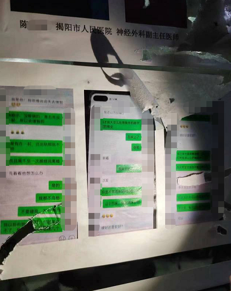 张贴在医院的多张图片显示,揭阳市人民医院神经外科副主任医师陈某某遭举报,称其“破坏人家家庭”,并曝光“与他人妻子出轨微信聊天记录”。疑似陈某某与一女子微信聊天记录显示,女子曾问“你心里想不想我离”“除非我们一起离”,对方回复“你离了我就不用顾忌他”。