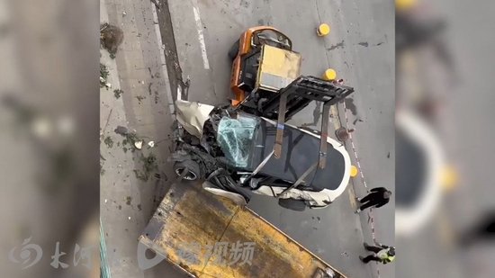 车祸现场的几段视频显示,车头严重变形,几乎看不出原貌,左右侧车门被打开,可见驾驶舱内蓝色的安全气囊。浏览现有视频,发现暂无视频拍到右前侧车轮状态。