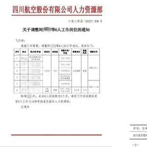 11月16日开始,一份川航股份人力资源部的岗位调整通知开始在互联网流传。该文件显示,阿某的工作岗位进行了调整,从飞行类别的“飞行员”岗位调整为管理类别的“大队助理”岗位,调整时间为11月1日。随后,有网友在自媒体平台发表质疑:“在内部被保护、潜伏下来还升官了?”……
