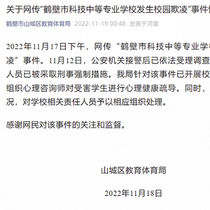 鹤壁市山城区教育体育局微信公众号11月19日消息,山城区教育体育局通报,11月17日下午,网传“鹤壁市科技中等专业学校发生校园欺凌”事件。11月12日,公安机关接警后已依法受理调查,目前,涉案人员已被采取刑事强制措施。该局针对该事件已开展校园法治教育,组织心理咨询师对受害学生进行心理健康疏导。同时,将根据调查情况,对学校相关责任人员予以相应组织处理。