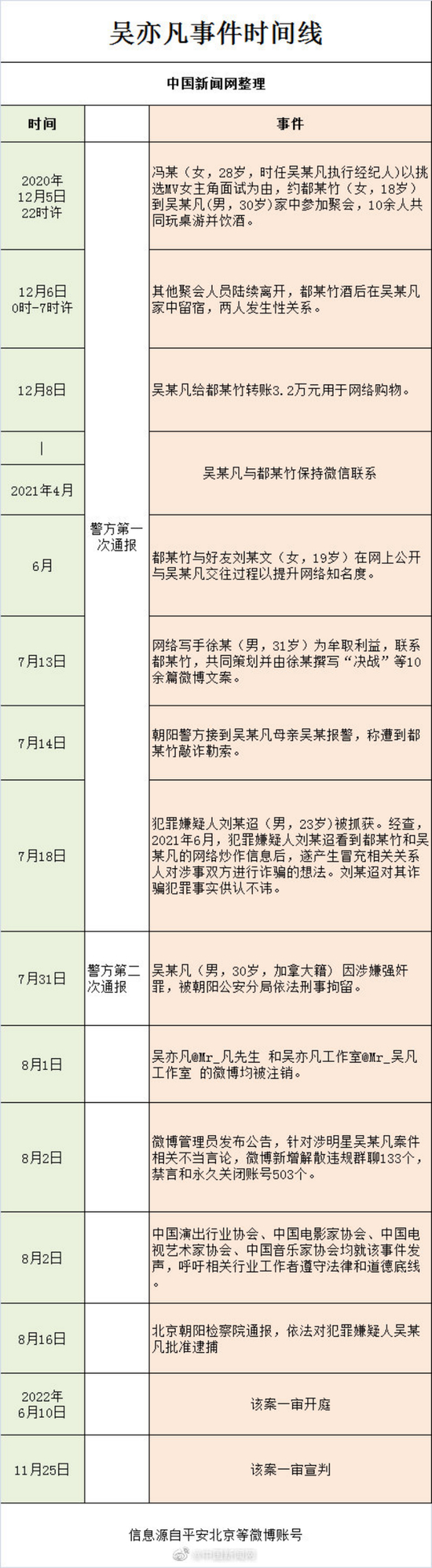 2022年11月25日上午,北京市朝阳区人民法院一审公开宣判被告人吴亦凡强奸、聚众淫乱案,对被告人吴亦凡以强奸罪判处有期徒刑十一年六个月,附加驱逐出境;以聚众淫乱罪判处有期徒刑一年十个月,数罪并罚,决定执行有期徒刑十三年,附加驱逐出境。