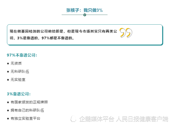张核子谈到,市场上只有两类基因检测公司,3%是靠谱的,97%都是不靠谱的。“我只做3%。”张核子所说的3%,指的是有国家颁发正规牌照、拥有自己科研队伍、有独立实验室平台的“靠谱公司”。