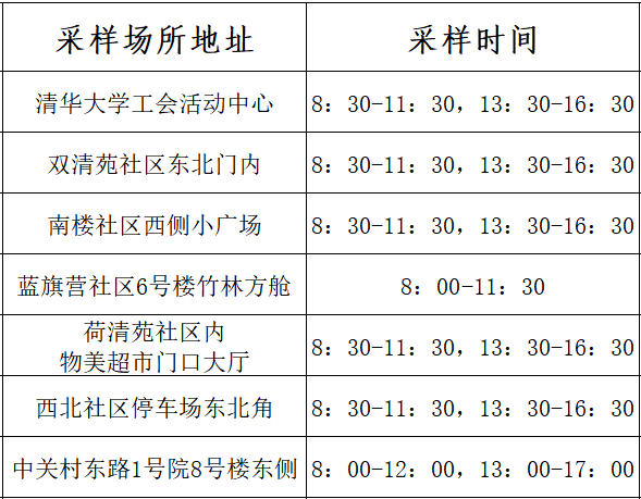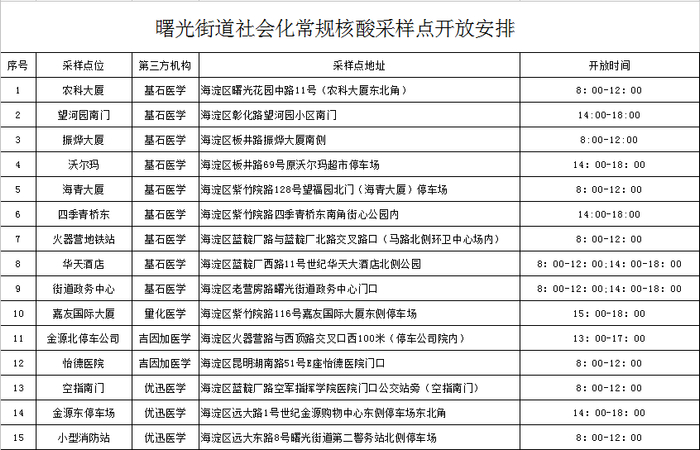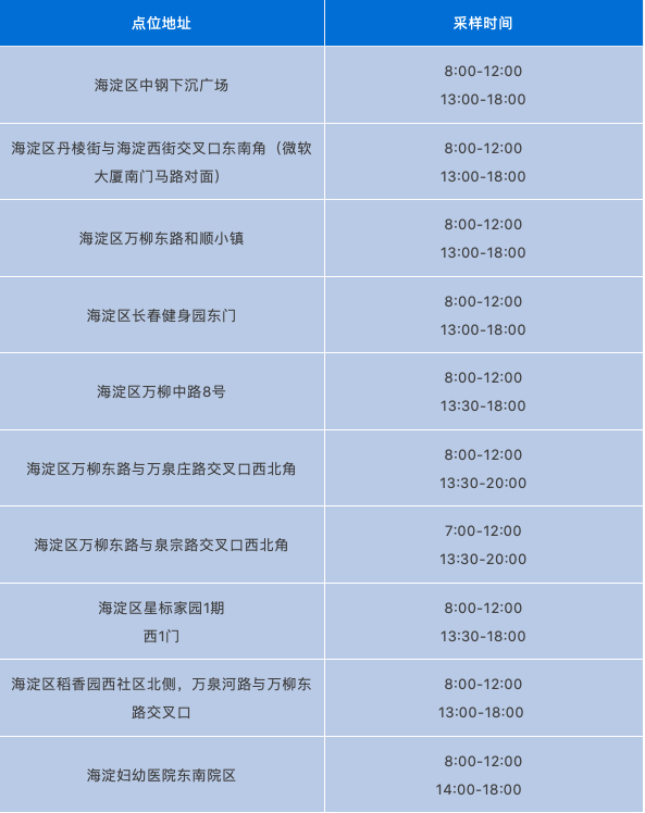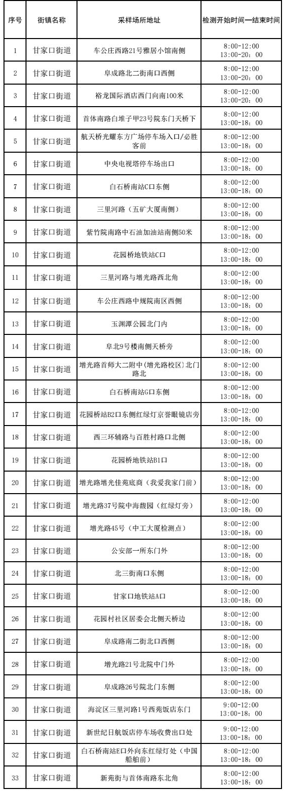 12月4日,海淀区甘家口街道公布常态化核酸检测采样点开放情况: