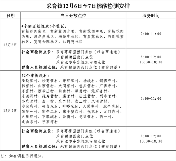 按照采育镇核酸检测工作安排,12月6日至7日,镇域内社会面点位开放采育葡萄园西门点位(社会面通道)、采育葡萄园南门点位、采育波尔多东区东南角点位;为弹窗人员开放采育葡萄园西门点位(弹窗通道)。