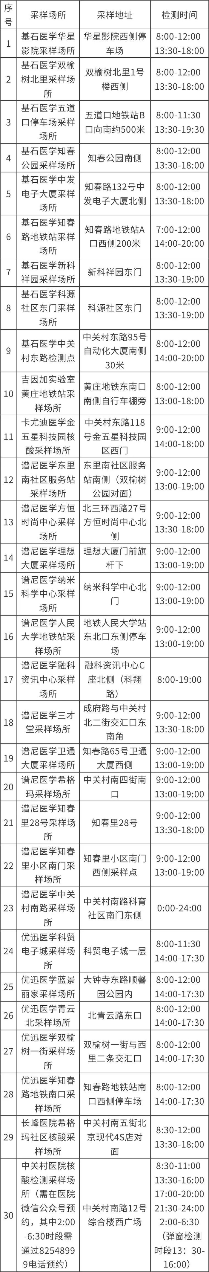 据海淀中关村街道12月5日发布,12月6日常态化核酸采样点名单如下——