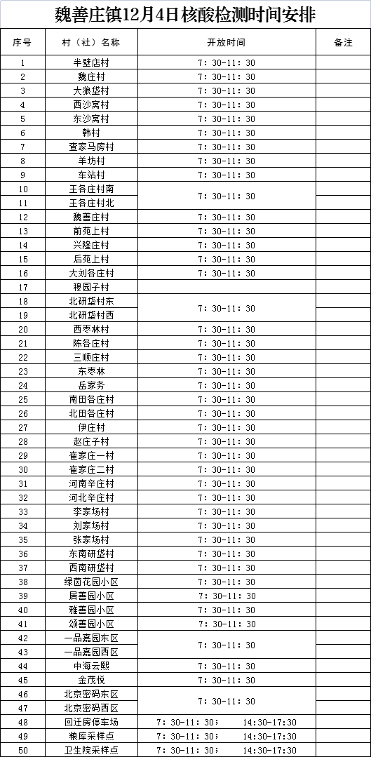 12月4日,魏善庄镇各村、小区社会面核酸检测点位正常开放,时间见下表。长期居家老人、每日网课学生、居家办公者等无社会面活动的人员,可以不参加核酸检测。