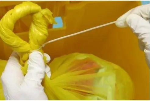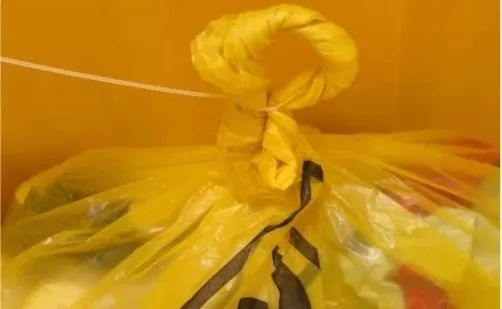 当盛装的医疗废物达到包装物或者容器的3/4时,可以采用这种有效的封口方式,家里的普通垃圾袋也适用。