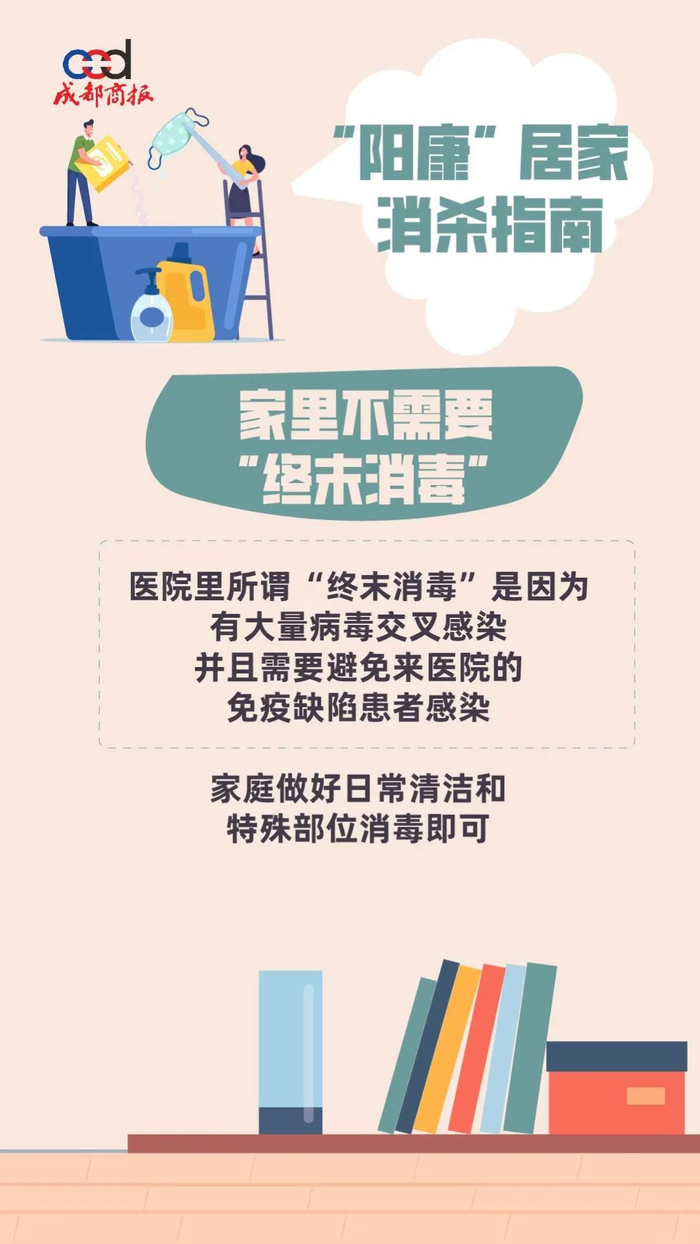 在新冠康复后,居家消毒应以清洁为主,做好重点部位消毒即可。比如:衣物床单等棉质物品、桌面凳子等硬质表面、马桶和冰箱。