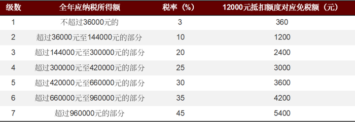 注:假设12000元抵扣额全部位于相应级数内,我国个人所得税起征点为每月收入5000元。资料来源:国家税务总局,中金公司研究部