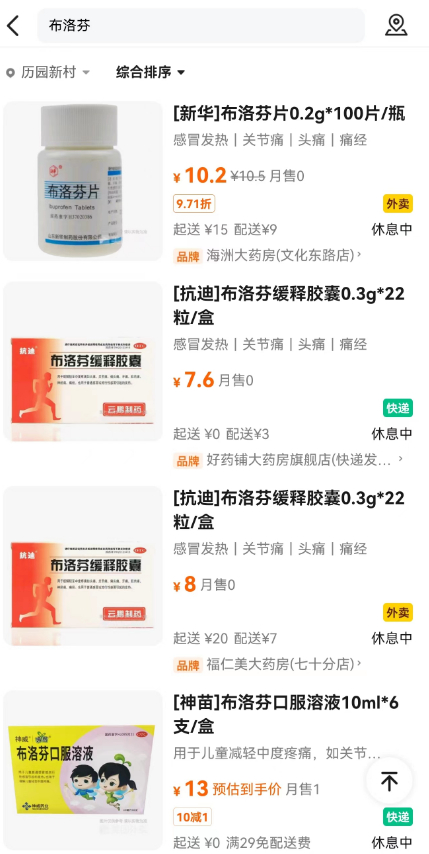 在网络平台上,记者搜索布洛芬,搜索出来的药店均显示为休息中,无法购买药品。记者在某外卖平台搜索布洛芬,显示的药店全部为暂停营业。记者发现,某些海外品牌类止痛药也已为抢光状态,显示12月25日预计到货。