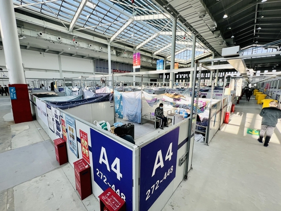 大巴车外,远处的崇明花博会复兴馆方舱,像一排排温室大棚。这是一处市级方舱,2022年4月投入使用,高峰期曾有2700多个床位。里面从早到晚都是亮的,赵昀戴着口罩与眼罩睡觉。外面很冷,洗漱时手会冻僵,方舱内热烘烘的,“一直很嘈杂,睡不好。”