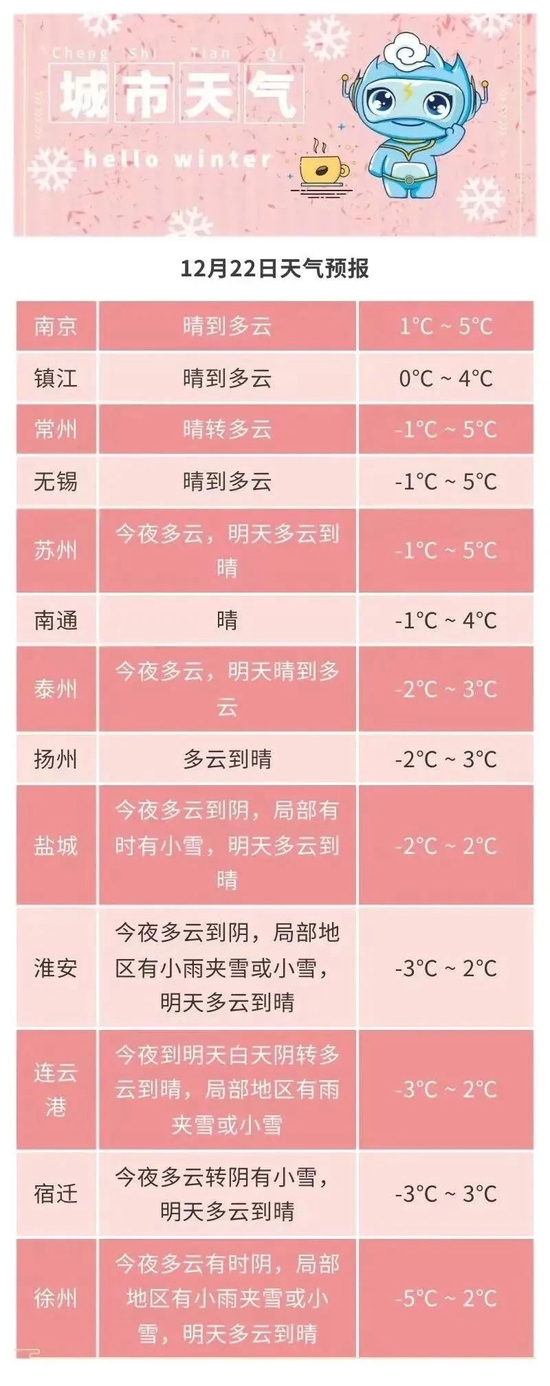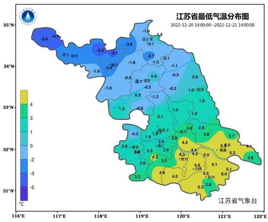 淮北地区1~2℃,苏南地区5℃左右