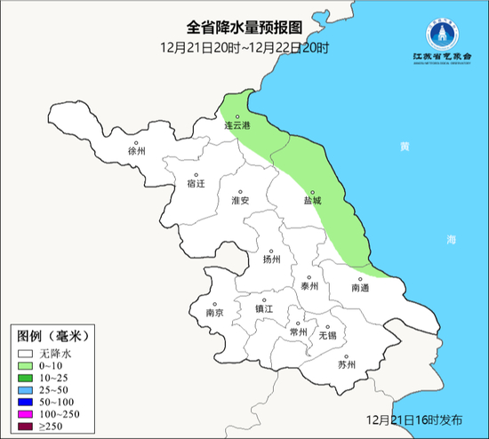 江苏省气象台2022年12月21日10时13分发布海区大风黄色预警信号:受较强冷空气影响,预计22日-23日连云港海区、盐城海区和南通海区将出现8级阵风9-10级的偏北大风。省应急厅(省减灾办)、省气象局提醒注意防范。
