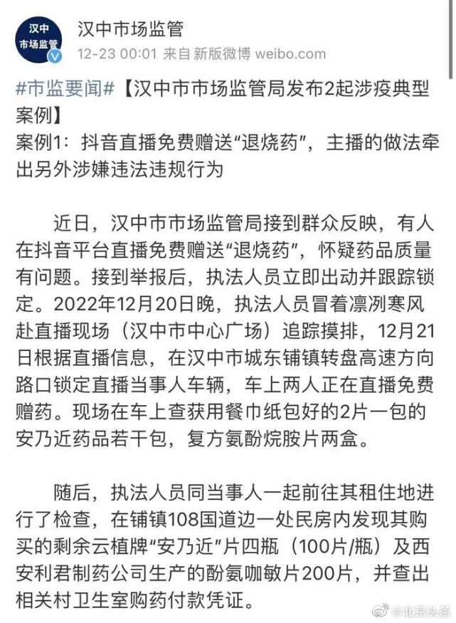 根据23日汉中市市场监督管理局官方微博发布的通报显示:近日接到群众举报称,有人在抖音平台直播免费赠送“退烧药”,并怀疑药品质量有问题。随后执法人员前往直播现场,当场查获用餐巾纸包好的2片一包的安乃近药品若干包,复方氨酚烷胺片两盒。同时,在其租住地发现购买的剩余云植牌“安乃近”片四瓶(100片/瓶)及西安利君制药公司生产的酚氨咖敏片200片,并查出相关村卫生室购药付款凭证。经调查,当事人是通过合法渠道购买的药品。这种行为虽未造成直接后果,但很危险,针对二人的直播赠药行为,执法人员对其进行了批评。关于村卫生室给患者超量开具处方药的问题,已依法移送南郑区卫计综合监督执法大队。