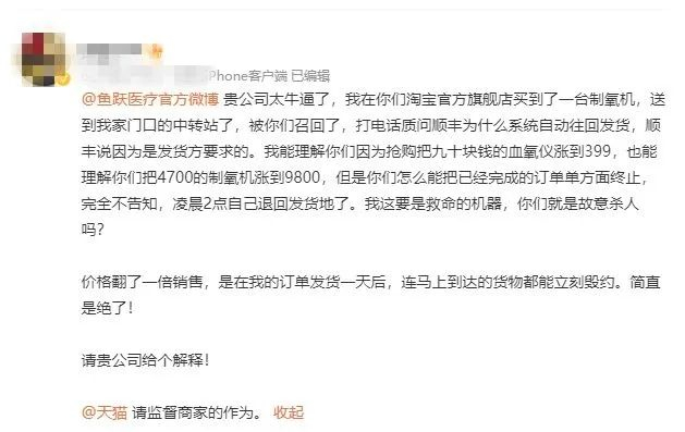 12月28日,有网友向鱼跃医疗官方微博投诉称,自己在其淘宝官方旗舰店购买了一台制氧机,但在商品即将送到家门口之际,制氧机却被商家“召回”。另外,消费者还质疑鱼跃医疗的血氧仪、制氧机因为抢购而出现翻倍涨价的情形。