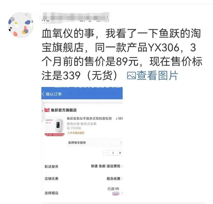 有网友发帖爆料,鱼跃医疗同款血氧仪“3个月前售价89元,现在涨到339元”,引发舆论关注。