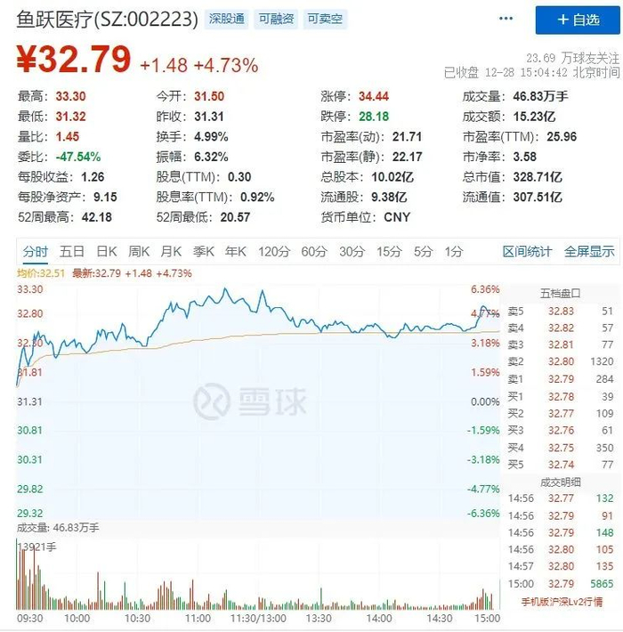 随着血氧仪板块近日上线,相关概念股高开高走。截至28日收盘,板块涨幅达10.35%,居同花顺板块涨幅榜首位。其中,鱼跃医疗(002223)报32.79元/股,涨4.73%,总市值328.71亿元。