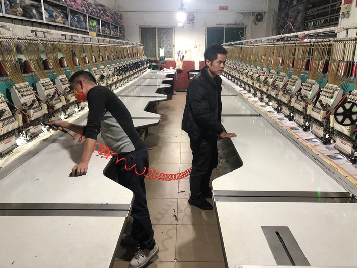 李鸿松(图左)在康乐村开了一家绣花厂。他说,复工近一个月,没什么订单,只能挣点房租钱。他对春节后的形势持乐观态度。