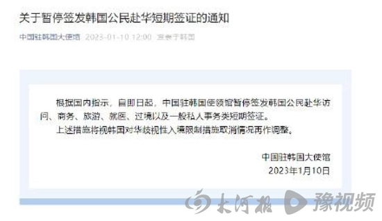 1月10日,中国驻韩国大使馆发布消息,根据国内指示,自即日起,中国驻韩国使领馆暂停签发韩国公民赴华访问、商务、旅游、就医、过境以及一般私人事务类短期签证。上述措施将视韩国对华歧视性入境限制措施取消情况再作调整。
