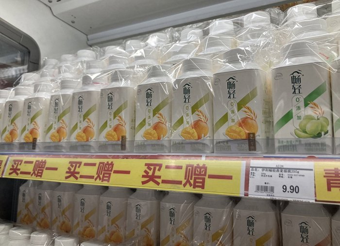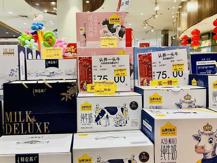 在北京丰台区永旺超市,三元极致有机钻石装纯牛奶、认养一头牛原味酸奶(常温)都在进行买一赠一的促销,原价85元/件的伊利金典有机纯牛奶最新售价65元/件,蒙牛特仑苏(3.6克蛋白)则从65元/件降到49元/件。