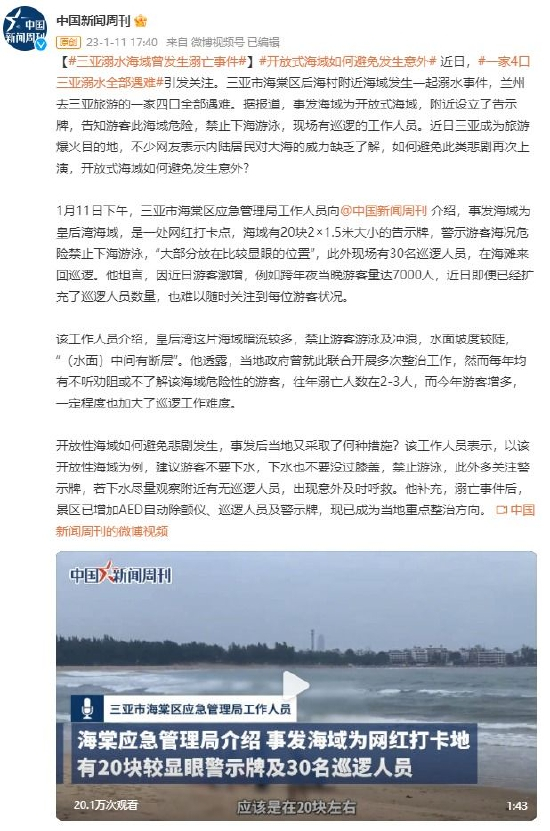 【#三亚溺水海域曾发生溺亡事件#】 近日,一家4口三亚溺水全部遇难引发关注。三亚市海棠区后海村附近海域发生一起溺水事件,兰州去三亚旅游的一家四口全部遇难。据报道,事发海域为开放式海域,附近设立了告示牌,告知游客此海域危险,禁止下海游泳,现场有巡逻的工作人员。近日三亚成为旅游爆火目的地,不少网友表示内陆居民对大海的威力缺乏了解,如何避免此类悲剧再次上演,开放式海域如何避免发生意外?
