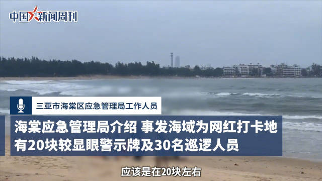 1月11日下午,三亚市海棠区应急管理局工作人员向@中国新闻周刊 介绍,事发海域为皇后湾海域,是一处网红打卡点,海域有20块2×1.5米大小的告示牌,警示游客海况危险禁止下海游泳,“大部分放在比较显眼的位置”,此外现场有30名巡逻人员,在海滩来回巡逻。他坦言,因近日游客激增,例如跨年夜当晚游客量达7000人,近日即便已经扩充了巡逻人员数量,也难以随时关注到每位游客状况。