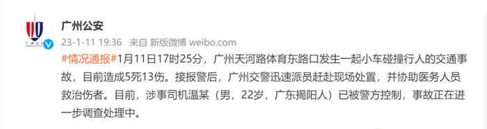 1月11日,广州公安局官方微博通报通报:1月11日17时25分,广州天河路体育东路口发生一起小车碰撞行人的交通事故,目前造成5死13伤。接报警后,广州交警迅速派员赶赴现场处置,并协助医务人员救治伤者。目前,涉事司机温某(男,22岁,广东揭阳人)已被警方控制,事故正在进一步调查处理中。