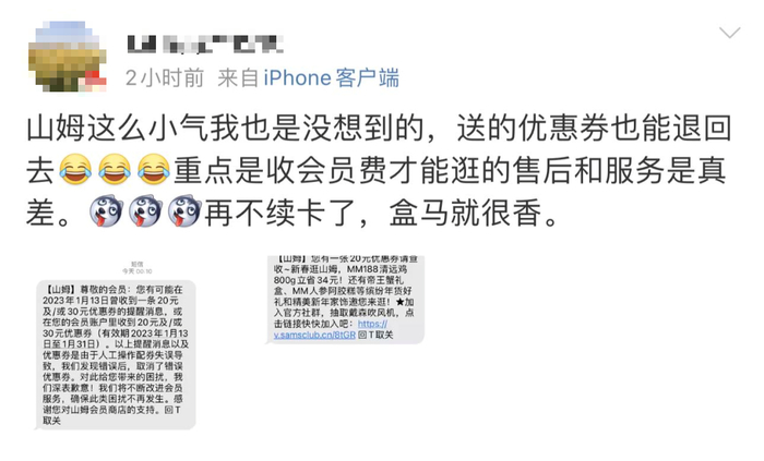 此事一起,不少网友都开始吐槽起“消失的优惠券”,大多数人觉得山姆这波误发又悄悄撤回的操作,有损品牌形象。