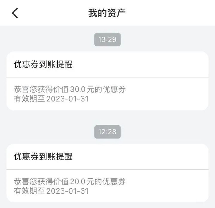 明明山姆App“我的资产”里,中午12:28和13:29收到了两张优惠券: