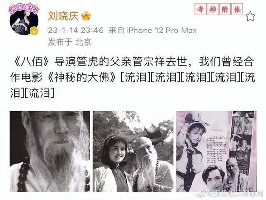 1月14号,刘晓庆深夜突然更新社交网,并官宣悲痛消息,她表示:《八佰》导演管虎的父亲管宗祥去世,我们曾经合作电影《神秘的大佛》,并晒出几张幕后合照悼念。