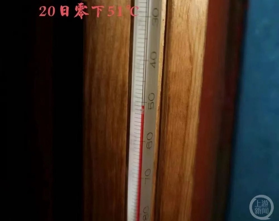 上游新闻(报料邮箱:cnshangyou@163.com)记者从漠河当地居民处了解到,20日是去年冬季以来气温最低的一天,早上温度计显示气温已至-51℃。