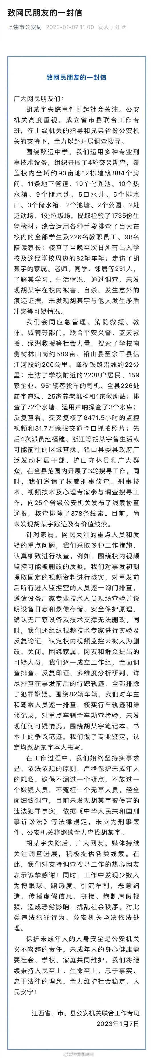 2023年1月1日,当地警方和小胡亲属就最新的调查情况进行了会见沟通,已排除校内人员犯罪可能。截至1月2日,胡鑫宇失踪已81天。1月7日,上饶市公安局发布《致网民朋友的一封信》,回应胡某宇失踪事件家属、网民关注的重点人员和质疑的重点问题。