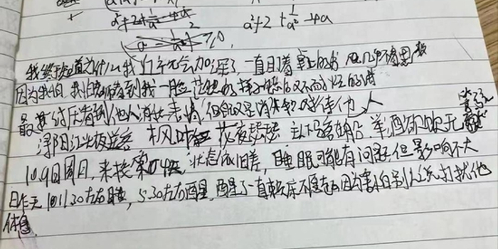 “我终于知道为什么我近视会加深了,一直盯着桌上的书看,几乎不抬头看黑板。因为我怕老师看到我一脸茫然的样子,然后又不耐烦地讲。”在多页笔记中,胡鑫宇表达出很在乎他人情绪的事例,“10月9日,来校几天后状态依旧差,睡眠可能有问题。。。。。。早上5点30分醒了一直赖床不愿起,因为害怕别人说打扰他休息。”