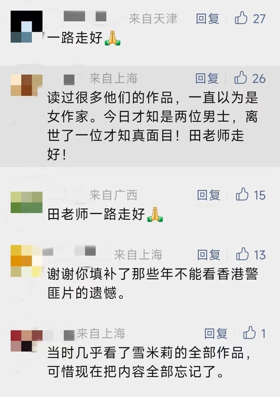 田雁宁辞世的消息传出后,文学界的朋友们在网络上纷纷发文哀悼,上世纪八九十年代“雪米莉”的读者们也留言寄托哀思。