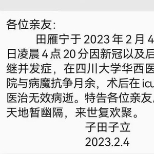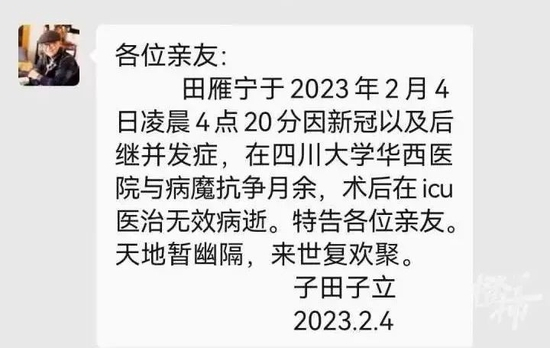 田雁宁因病在成都去世