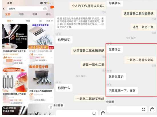 用“笑气”为关键词,搜索购物平台,确实已无法搜到相关物品。但在输入“奶枪”“气”等关键词后,会显示出“奶油枪二氧化碳小气瓶”、“咖啡气瓶”等字样的产品。此外,还有商家会标注为“氮气”。记者随机询问一家商家,“个人是否可以买”,对方表示可以买,记者向其确认是否是“一氧化二氮”,得到商家肯定的回答。