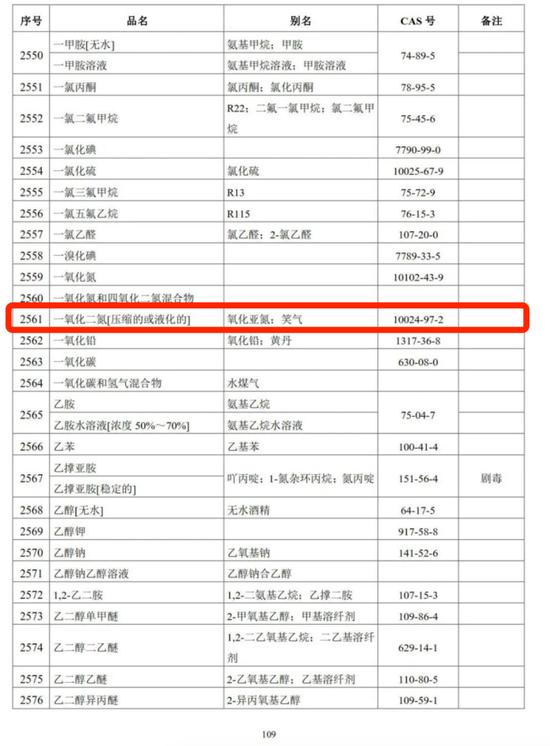 事实上,我们国家在对“笑气”的管理上,确实非常严格——2015年,“笑气”被列入《危险化学品目录》监管,具有麻醉作用,吸食可能引起高血压、晕厥,甚至心脏病发作等症状。2016年的世界毒品调查报告显示,“笑气”已经成为全球第七大流行滥用药物。此外,根据应急管理部等十部门最新发布的《危险化学品目录(2022年调整版)》,“一氧化二氮[压缩的或液化的]”也被归类其中,序号2561。