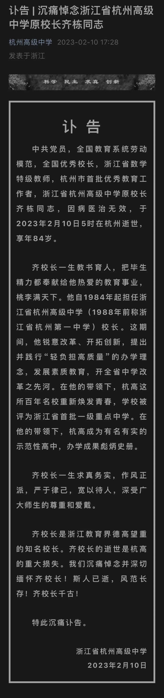 昨晚,杭州高级中学公众号发布《讣告 | 沉痛悼念浙江省杭州高级中学原校长齐栋同志》。