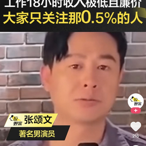 虽然在剧中张颂文饰演的高启强是手握巨额资产的强盛集团“掌门人”,为人狠辣,但生活中的张颂文谦逊平和,且多年来始终没有大火,即便这几年因为《隐秘的角落》等作品而为人所熟知,也并未成为流量明星,甚至依然会被“换角”,他也曾诉苦自己买不起房子。近期在大量社交平台上,出现了张颂文在接受采访时的一段话,其表示很多演员一天工作18个小时,拍戏4个月只有几千元,甚至全年可能也就这几千元收入,中国99.5%的演员都是这样的低收入状态,只有0.5%的演员是高收入的。