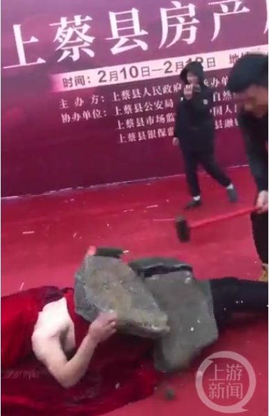 上游新闻记者注意到现场有两段视频在网络引发热议:展销会台上,一名穿着暴露的女子在跳钢管舞;一名光着膀子的男子躺在台上,胸部到大腿的位置上放着一块石头,有男子拿铁锤锤击石头,石头断成两半。