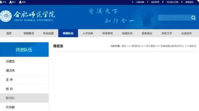 @大河报消息,2月19日,“合肥教育名师陈宏友讲座中被学生轰下台”一事引发网友热议。据悉,陈宏友系合肥师范学院教师教育学院副教授。20日,记者发现合肥师范学院官网,陈宏友的履历介绍一片空白,其他教师履历介绍均正常呈现。在合肥师范学院教师教育学院官网中,副教授介绍一栏,已看不到陈宏友的相关介绍信息。