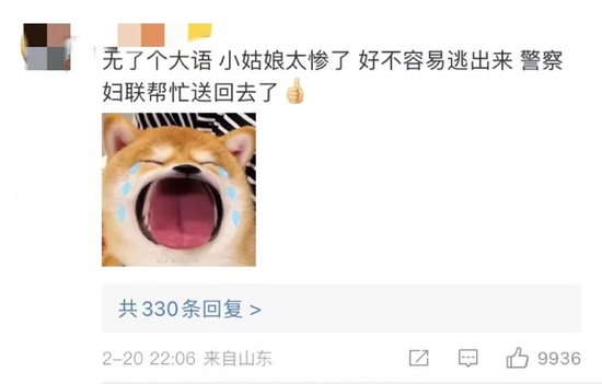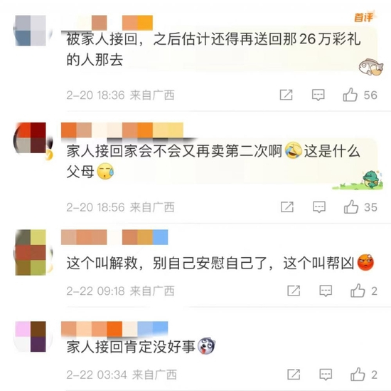 在田东县暂住几日后,2月17日,少女的父亲和哥哥从四川来广西接走女儿。未成年少女逃婚事件在网络中发酵,得知少女被家人接走,很多网友表示痛心,“那女孩报的警还有何意义?到家之后,如果她的父母还要将其卖给男方,她想逃就难了!”