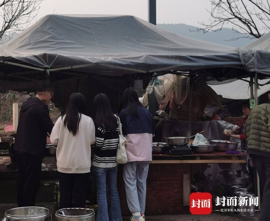 3月7日下午5点半,宜宾三江新区文博路两边的工地食堂已经聚集了不少大学生。几家工地食堂面前摆放着桌子,桌子上蒜薹炒肉、红烧茄子、火锅鱼、凉拌菜等装在一个个盆里,大学生们三三两两围在桌子面前选择自己喜欢的菜品。