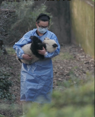 饲养员抱起大熊猫,用手清理掉它身上的杂草灰尘,抱在怀里抚摸安慰了半天……