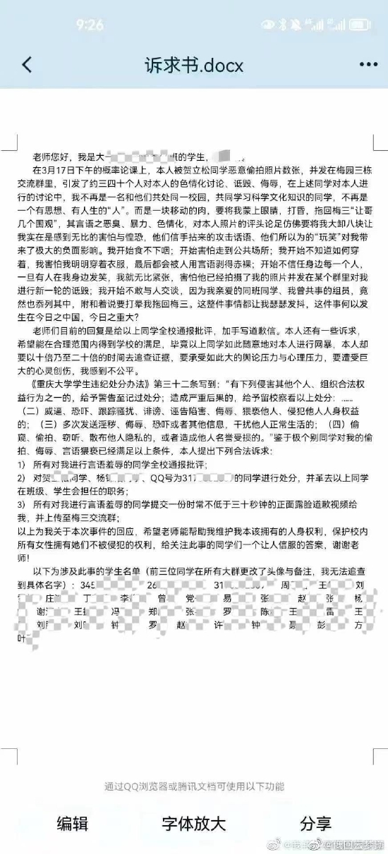 同时,爆料网友“阿洛喜欢打游戏”发布了当事女生的诉求书。诉求书显示,事情发生在3月17日下午的概率论课上,该女生愤怒地写道:“我不再是一名和他们共处同一校园,共同学习科学文化知识的同学,不再是一个有思想、有人生的‘人’……”