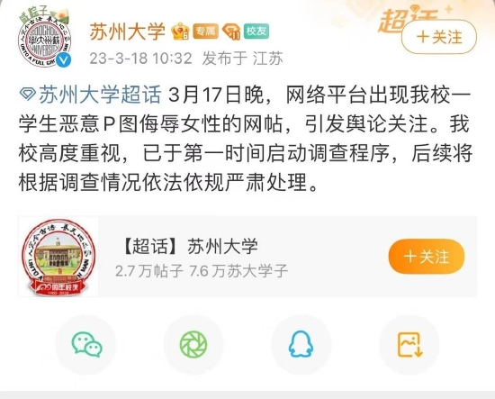苏州大学回应该校男生恶意P图侮辱女性事件。