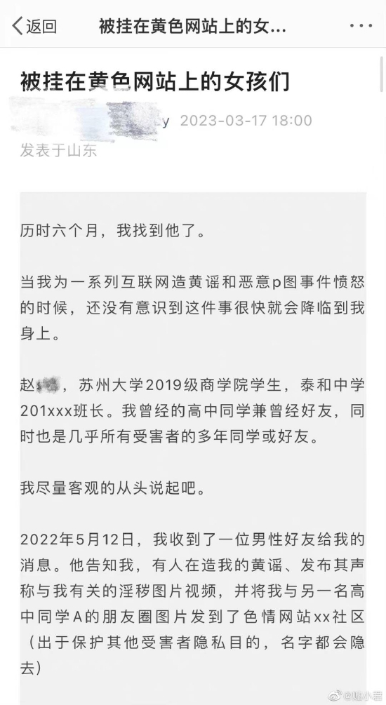 网络上出现苏州大学一位男生恶意P图侮辱女性的帖子,当事女生历时6个月,最终找到了“黄谣”的源头——其高中同学兼好友的赵某。