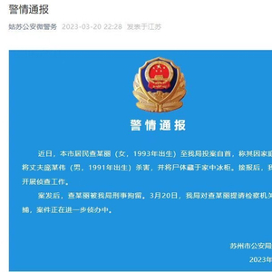 3月20日晚,苏州市公安局姑苏分局发布警情通报称:近日,本市居民查某丽(女,1993年出生)至我局投案自首,称其因家庭矛盾,将丈夫庞某伟(男,1991年出生)杀害,并将尸体藏于家中冰柜。接报后,我局立即开展侦查工作。案发后,查某丽被我局刑事拘留。3月20日,我局对查某丽提请检察机关批准逮捕,案件正在进一步侦办中。